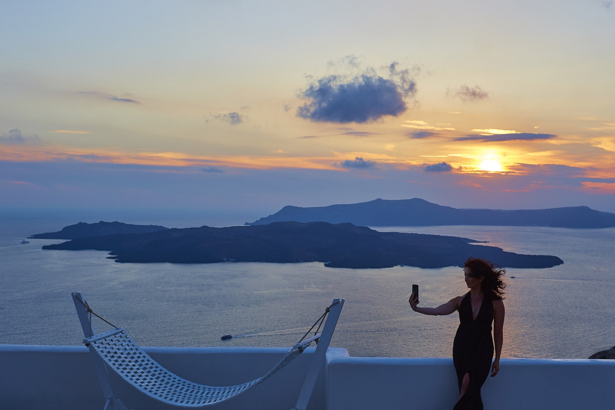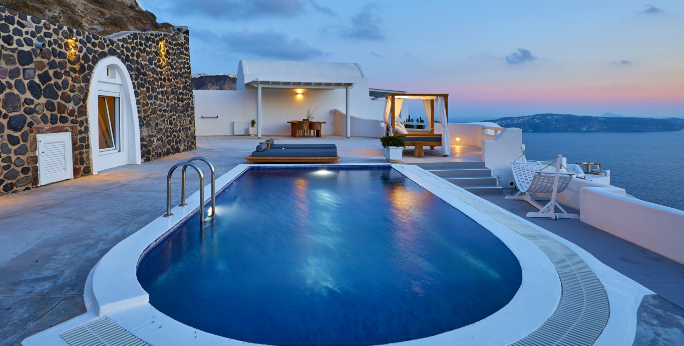 This open-plan cave suite blends sophistication and comfort, featuring a living area with a king-size bed and a cozy coffee nook with a dining space. The grotto-style bathroom, complete with a cave shower and a hand-crafted hydro-massage tub, offers stunning Caldera views through a grand glass window. Step through the balcony doors to your private cliffside terrace, a 23-meter expanse boasting a swimming pool, hot tub, outdoor shower, and a unique cave bed—all framed by breathtaking vistas of the volcano and the golden Santorini sunset.