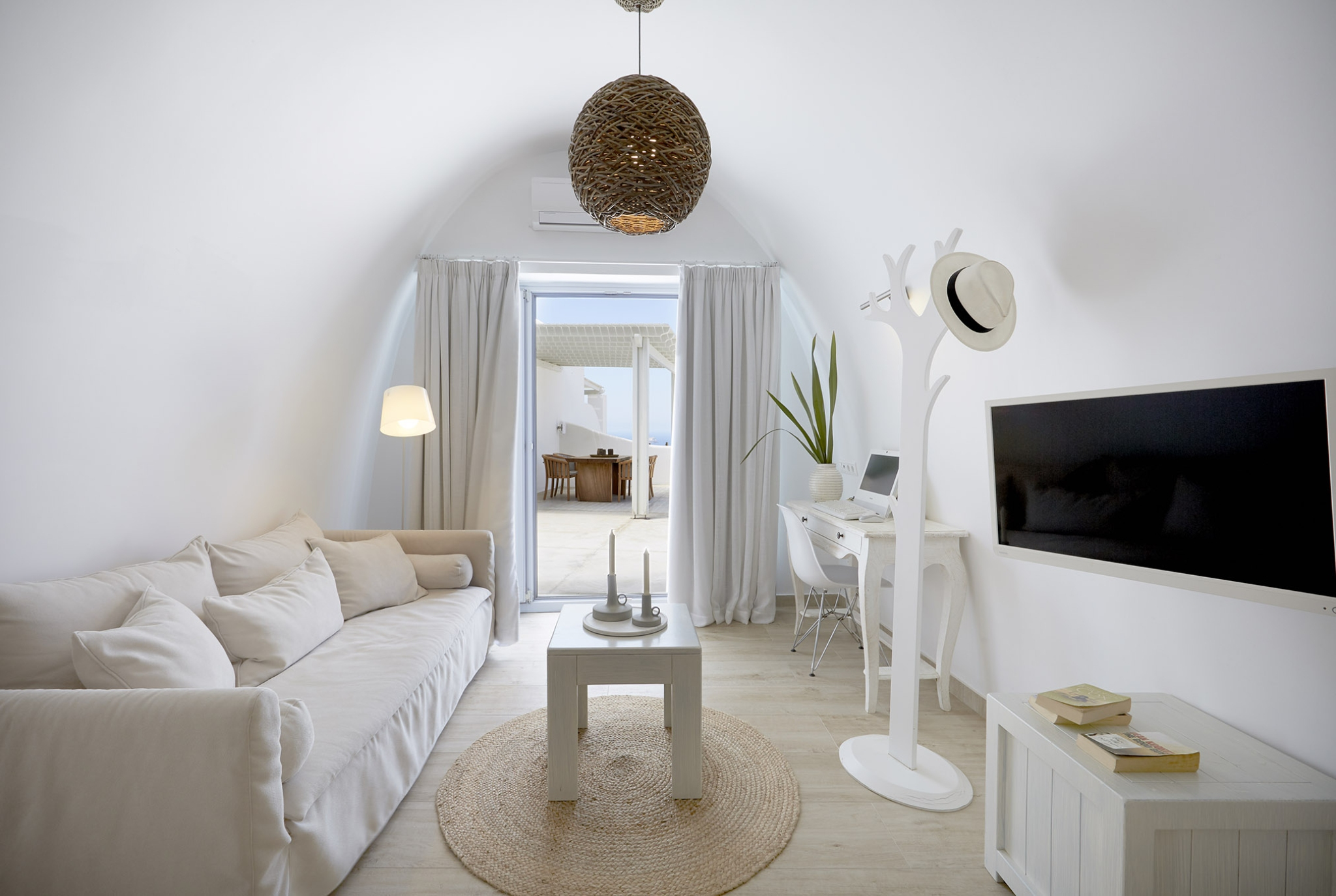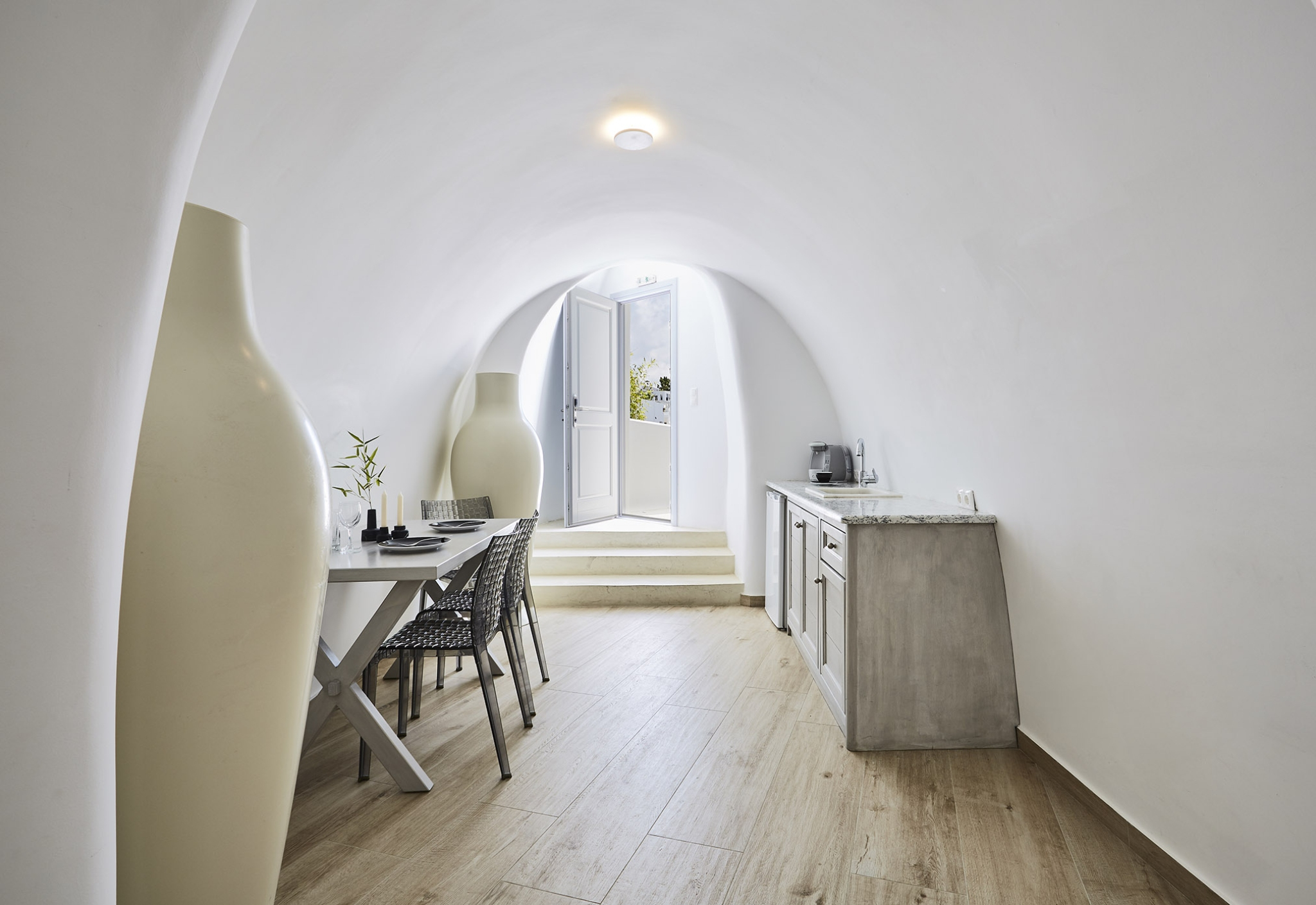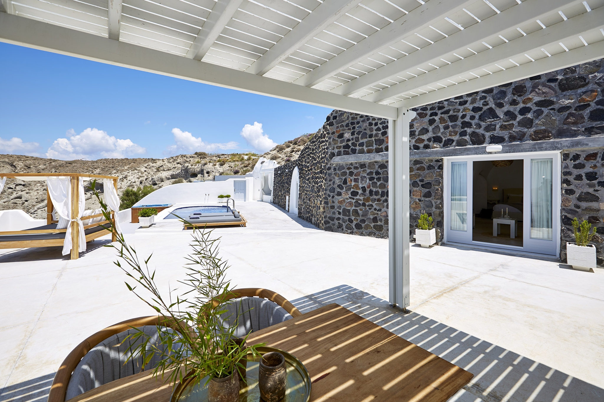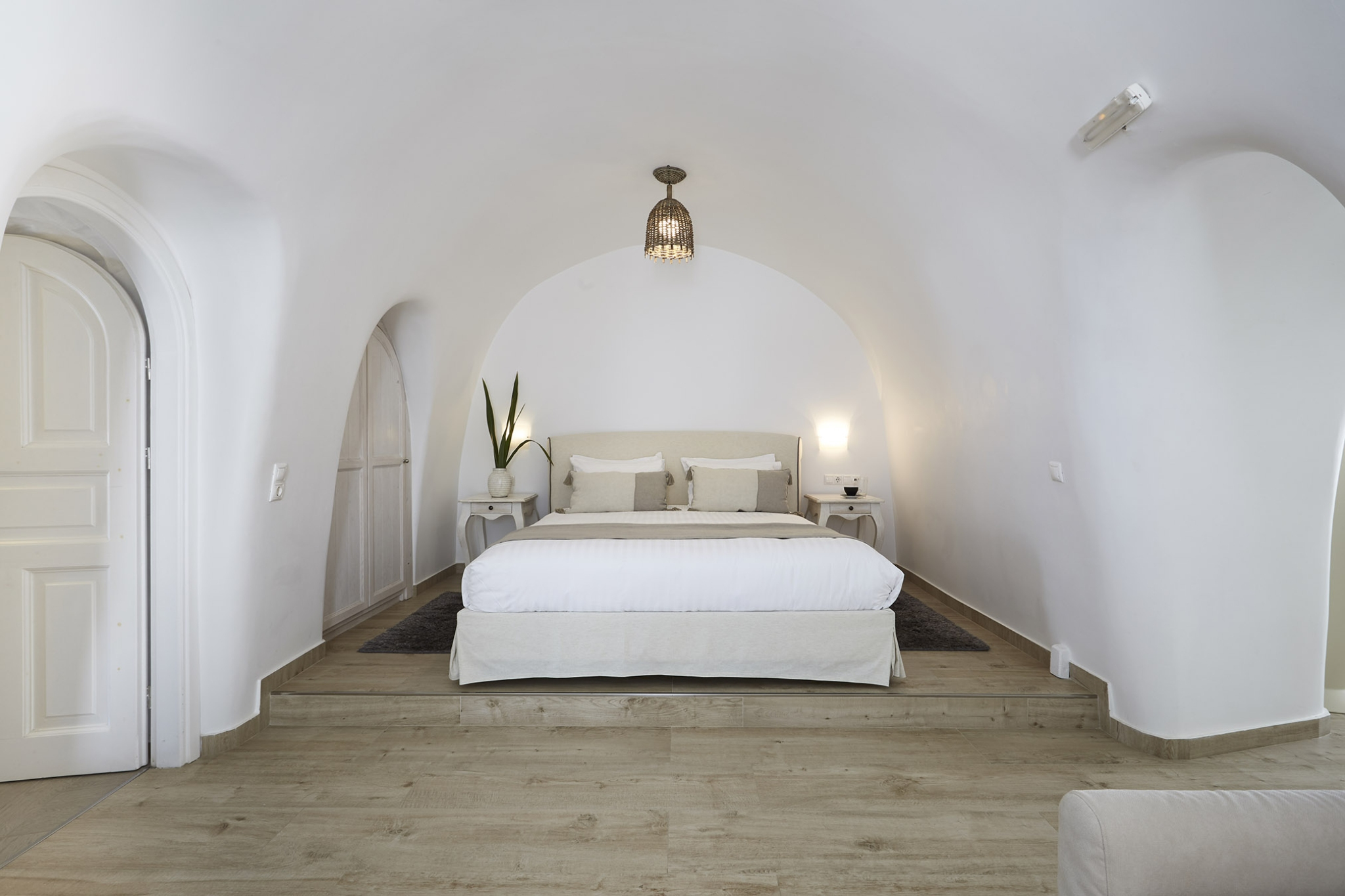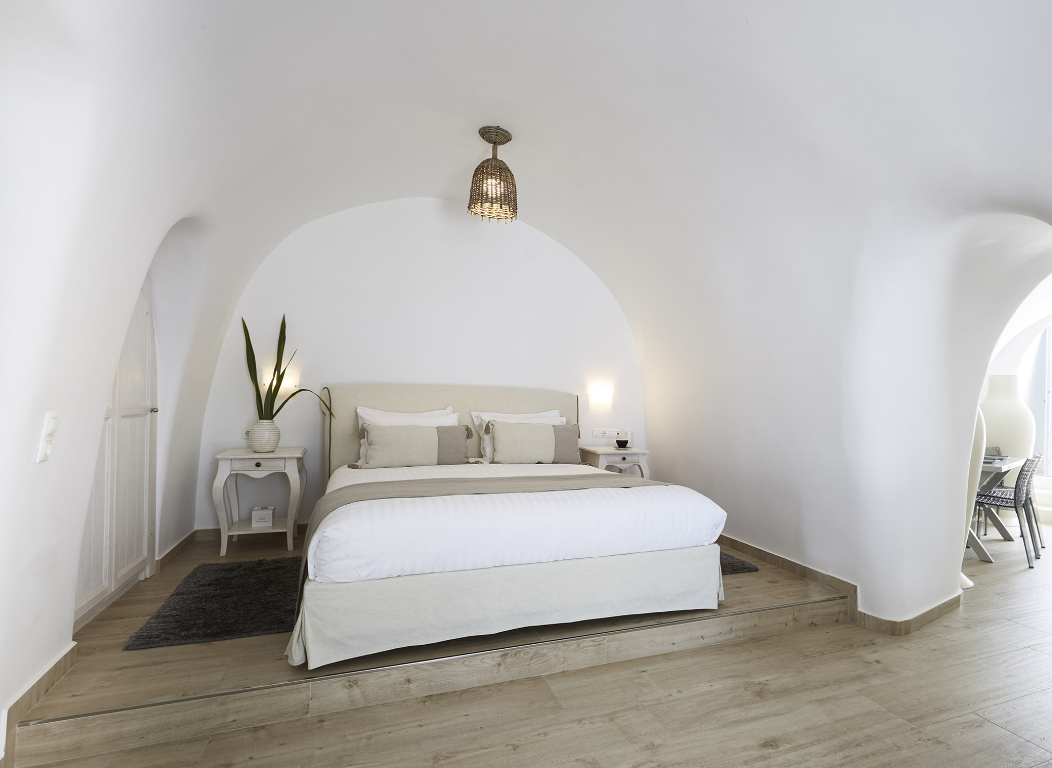 Luxury abounds in the Superior Honeymoon Villa, a sanctuary radiating unparalleled sensuality. Designed in the traditional Cycladic style, its smooth, curvy white walls and domed ceilings embody minimalist elegance, creating the perfect setting for an unforgettable romantic escape.
